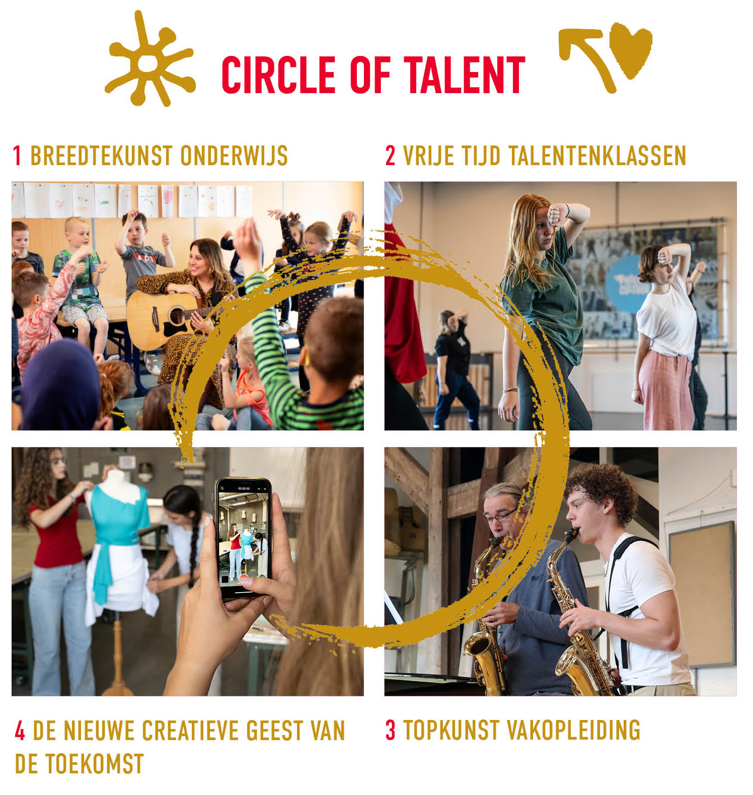 Via de Circle of Talent keten leveren we een jongvolwassene af met zelfvertrouwen en zelfreflectie, die gewend is om goed te kunnen communiceren, performen, samenwerken, oefenen, studeren en hard te werken. Skills die nodig zullen zijn voor de toekomstige banen die wij nu nog niet kennen. We leveren een jongvolwassene af die verder kijkt dan zijn of haar neus lang is en klaar is voor een mooie creatieve toekomst. #circleoftalent